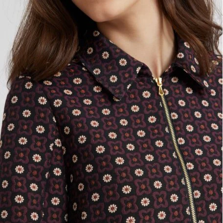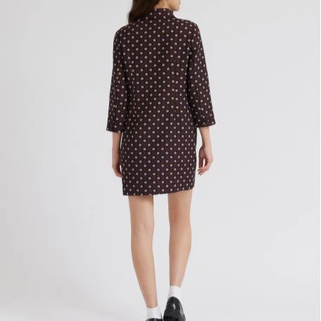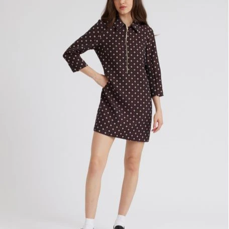 Robe courte simple et rétro décorée d’un zip sur l’avant. On la reconnait aussi à ses manches 3/4, dotées d’une fente et de deux bouton