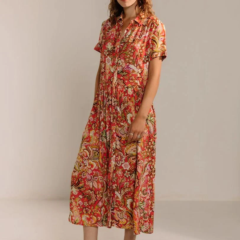 Robe chemise longue à manches courtes. Ses motifs fantaisies aux couleurs rosées jaunes et vertes sont sublimes ! Il y a 2 poches sur les côtés.
