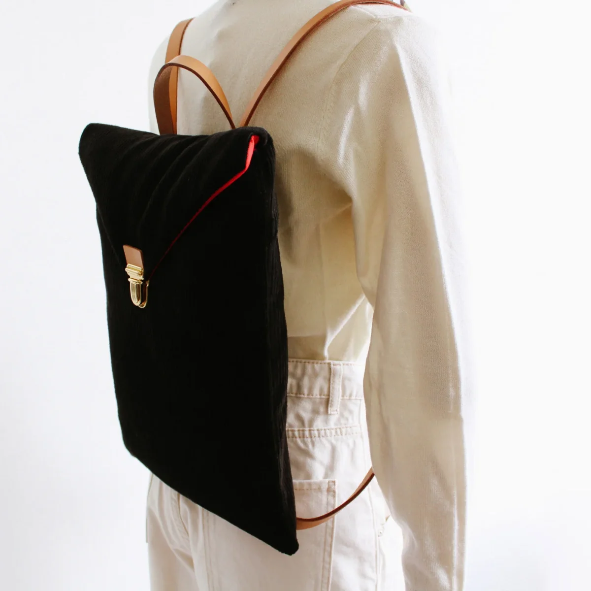 En velours côtelé noir et lanières en cuir végétal, ajustables elles vous apporteront confort et praticité au quotidien! Fermeture type cartable. Le sac est rembourré pour assurer la protection nécessaire à votre ordinateur.