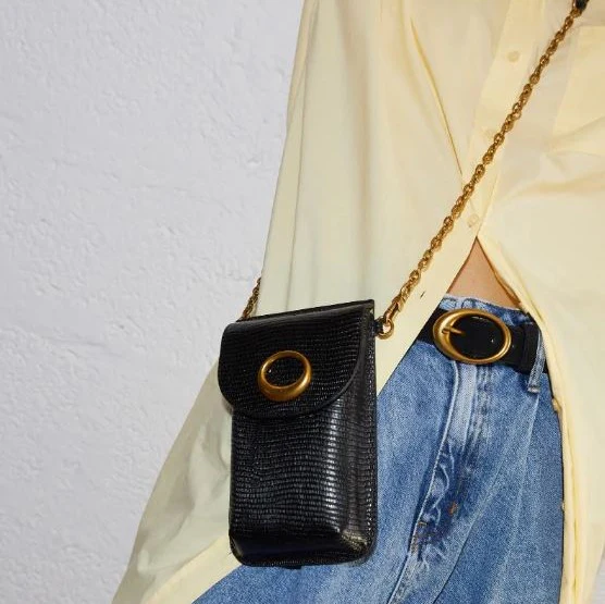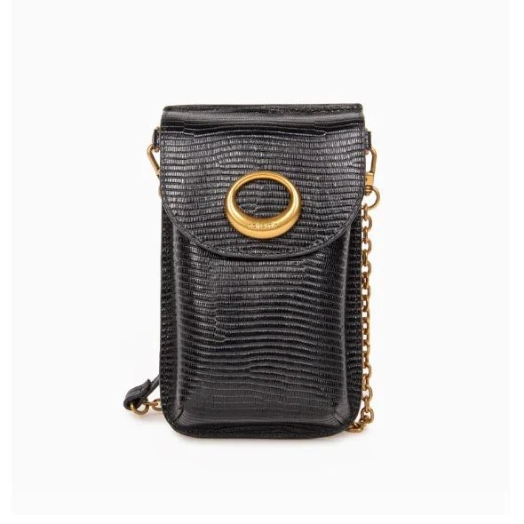 Etui pour téléphone et autres essentiels (iPhone, iPhone Pro, iPhone Pro Max) avec une fermeture pression aimantée. Sa bandoulière à chaînes est amovible (longueur 120 cm). Extérieur : une poche plaquée au dos. Intérieur : deux rangements cartes.Matières : Cuir de vachette / doublure microfibre.Dimensions : H 20 x L 12 x P 3 cm)