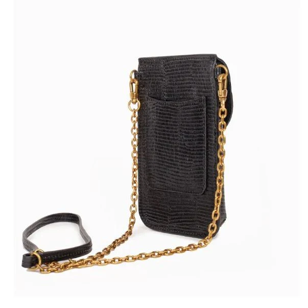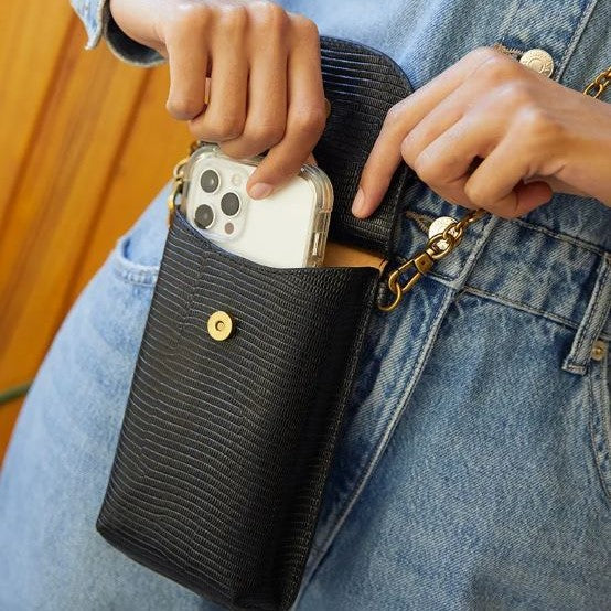 Etui pour téléphone et autres essentiels (iPhone, iPhone Pro, iPhone Pro Max) avec une fermeture pression aimantée. Sa bandoulière à chaînes est amovible (longueur 120 cm).