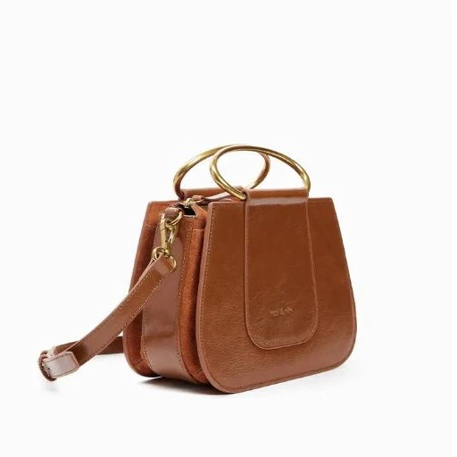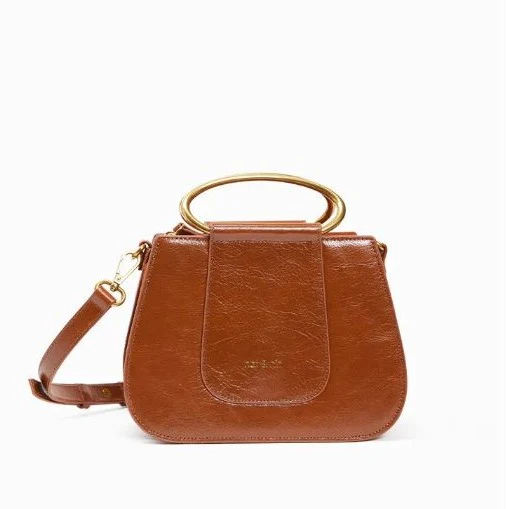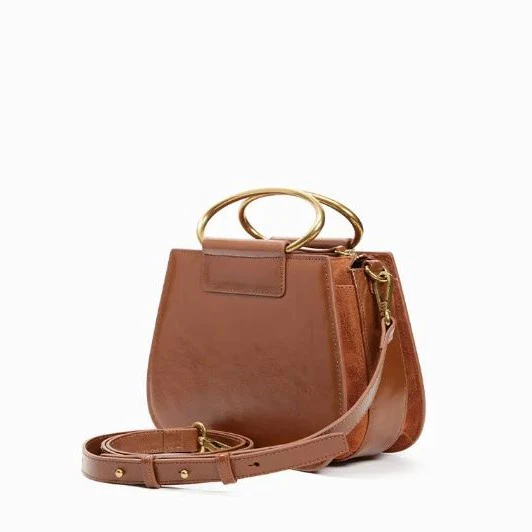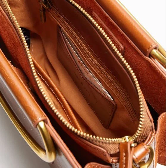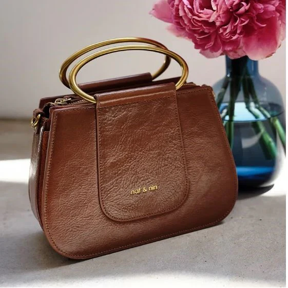 Sac en cuir porté main ou bandoulière, avec poignées métalliques.