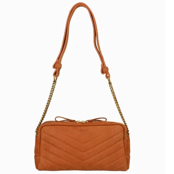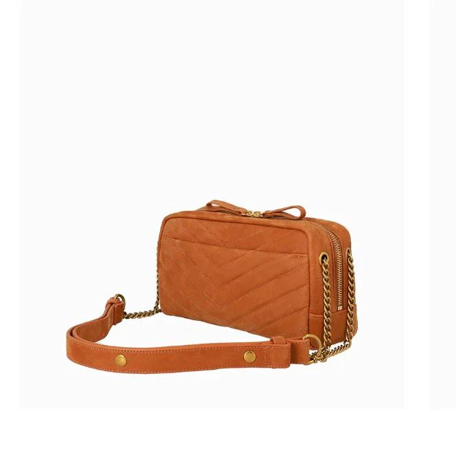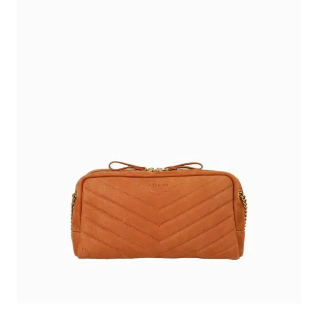 Sac porté épaule couleur épice et effet matelassé. Il a une bandoulière en chaînes et en cuir réglable (longueur max. 120 cm). Fermeture zippée avec deux languettes