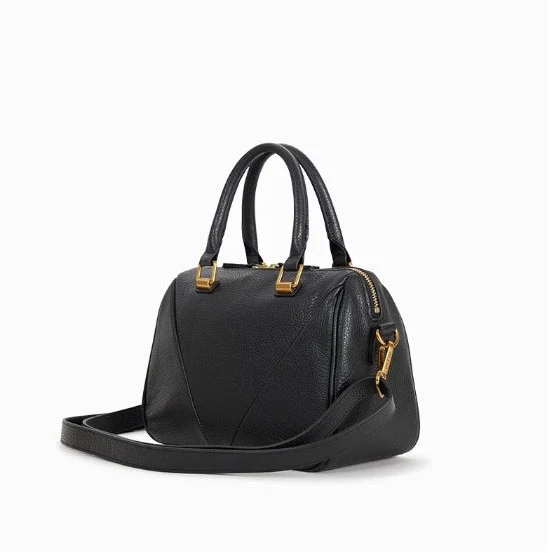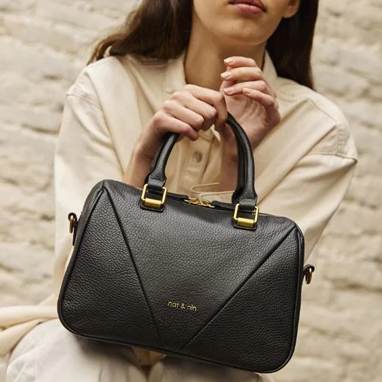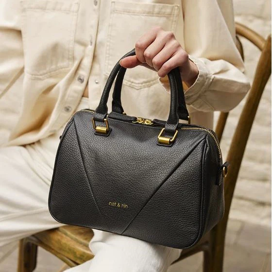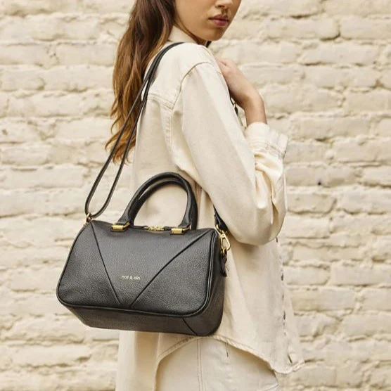 Sac bowling noir grainé en cuir de vachette doté d’une couture en V pour plus de style. Il se porte à la main ou avec sa bandoulière tendance. Un moyen chic et pratique de transporter ses affaires !