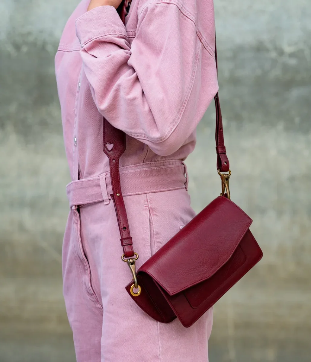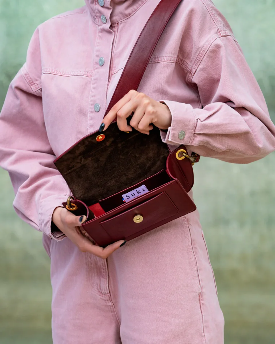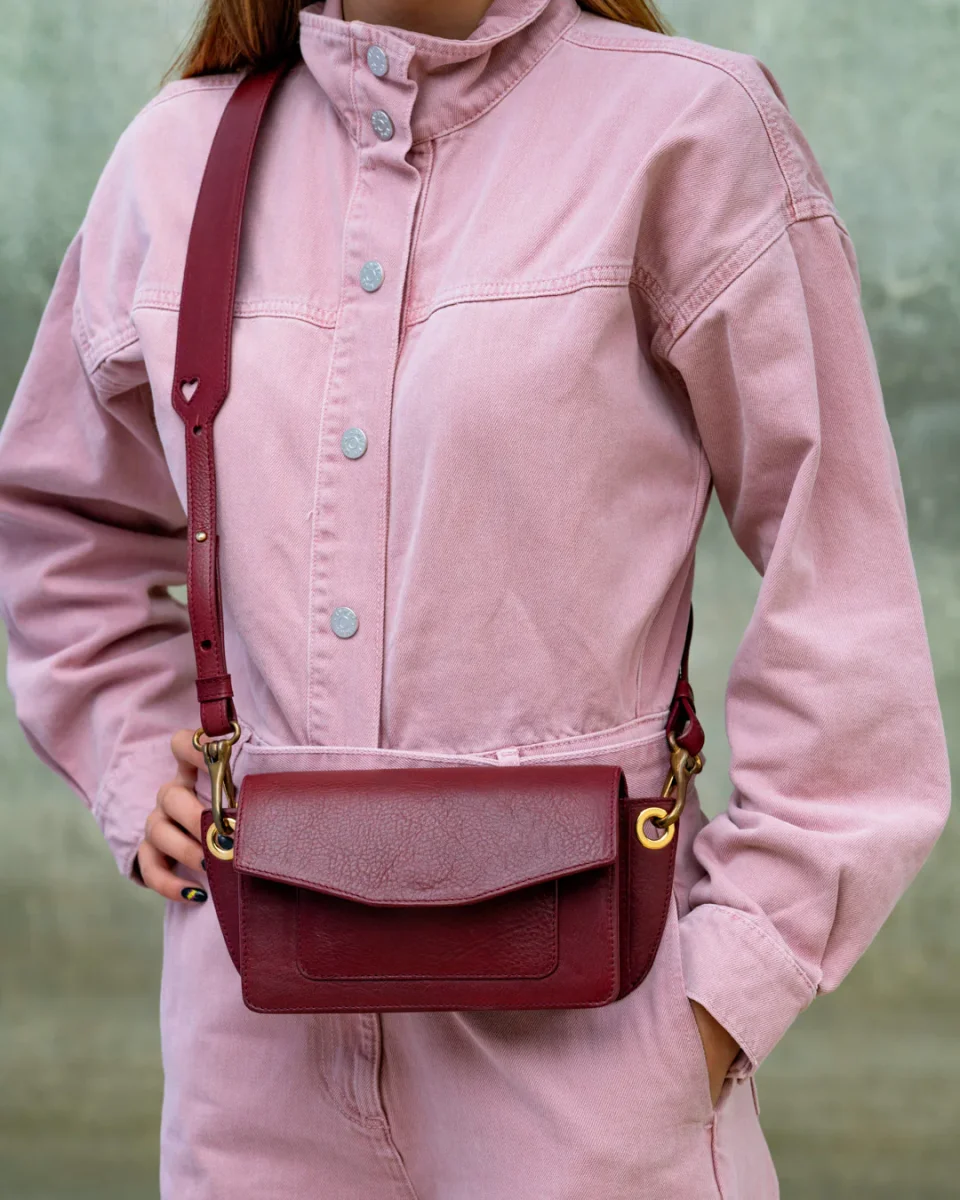 Petit sac en cuir bordeaux Prune, à bandoulière amovible.
