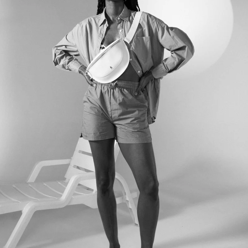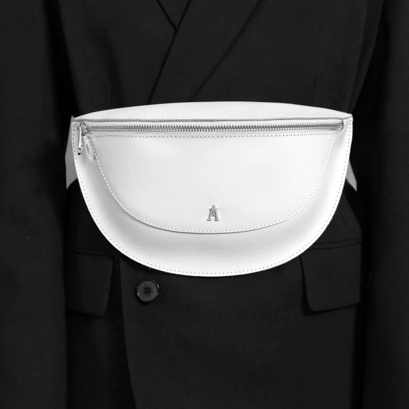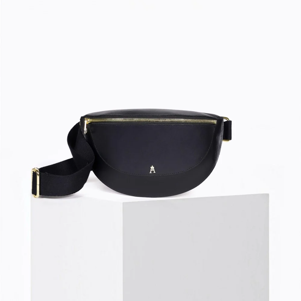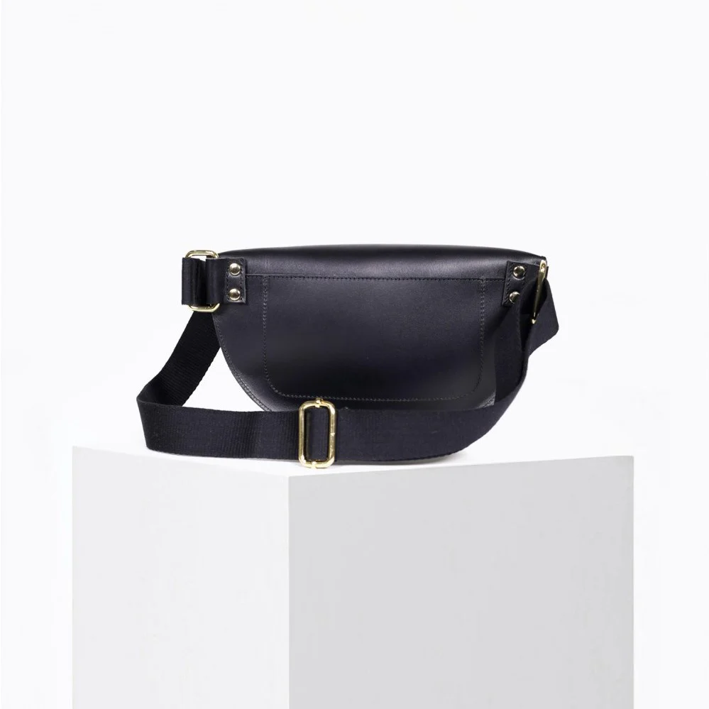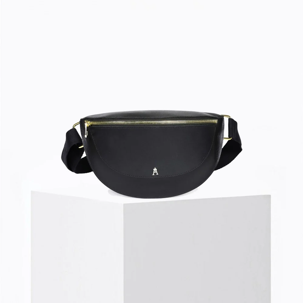 Sac banane moderne en cuir de vachette noir. Il épouse parfaitement votre buste grâce à sa forme arrondie !