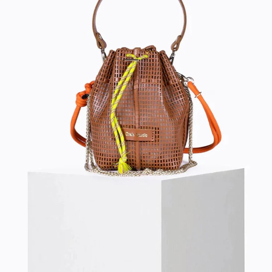 Bibi est un mini sac seau au design audacieux, entièrement fabriqué à la main.