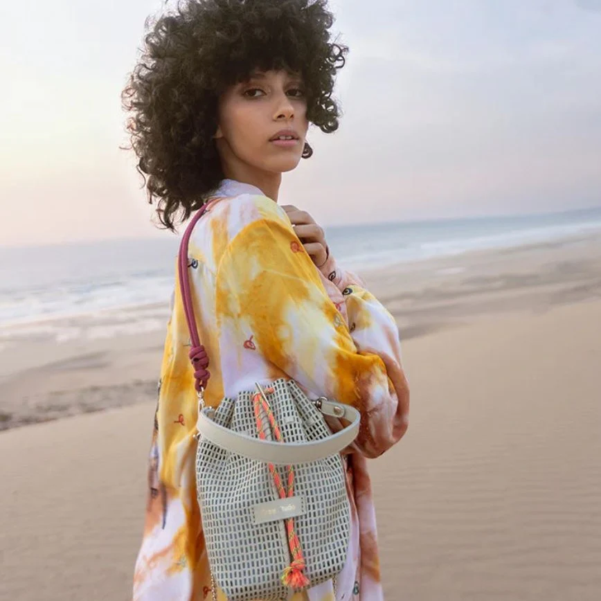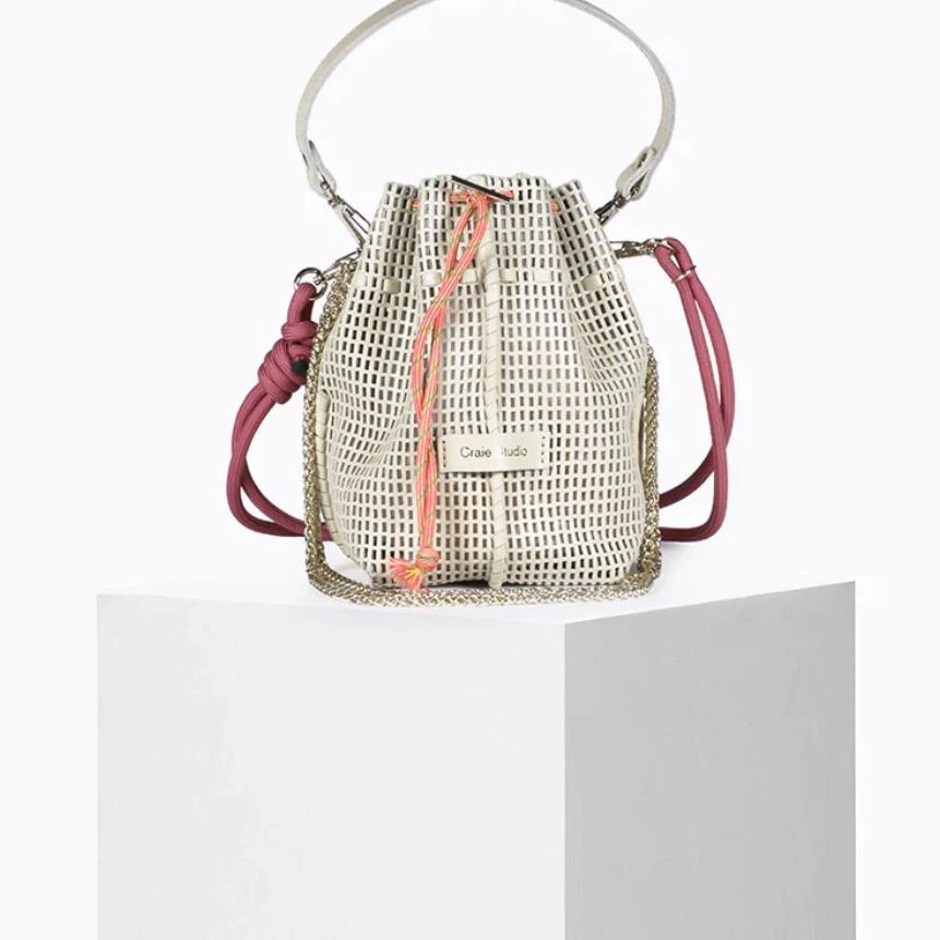 Le sac Bibi crème, est une nouveauté de la marque. Ce sac sceau composé de cuir d’agneau argenté, est perforé de petits carrés pour un style unique et aérien.