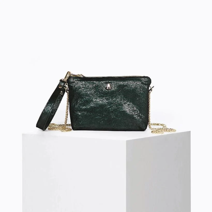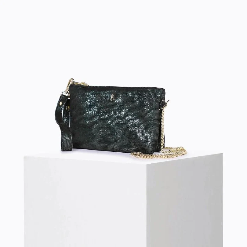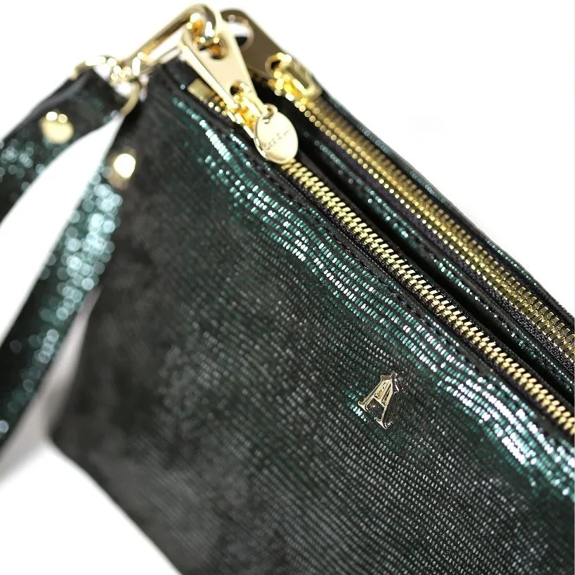 Sac souple et léger en cuir d’agneau noir, métallisé qui se compose de 2 pochettes zippées. Elles sont piquées ensemble pour créer au centre une poche supplémentaire, idéal pour accueillir vos clés ou votre téléphone portable.