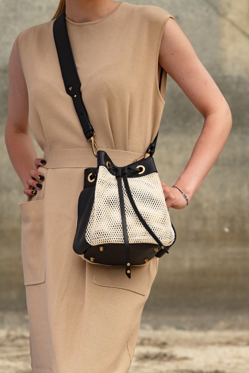 Sac seau en maille de filet de coton bio et cuir noir.