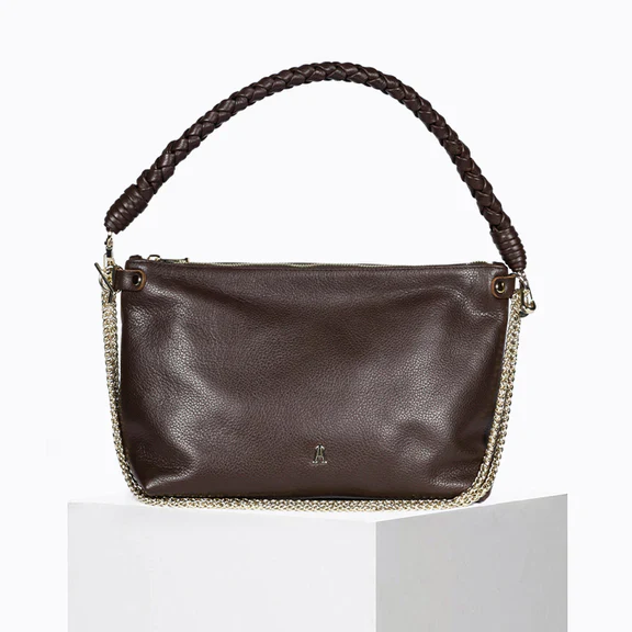 Réalisé en cuir de vachette grainé . Sa silhouette souple et généreuse est sublimée par une poignée en cuir tressé ton sur ton, remplaçant la traditionnelle corde pour une allure encore plus élégante. Ce modèle est livré avec une bandoulière en chaîne dorée amovible, permettant un porté épaule ou crossbody selon vos envies. On aime […]