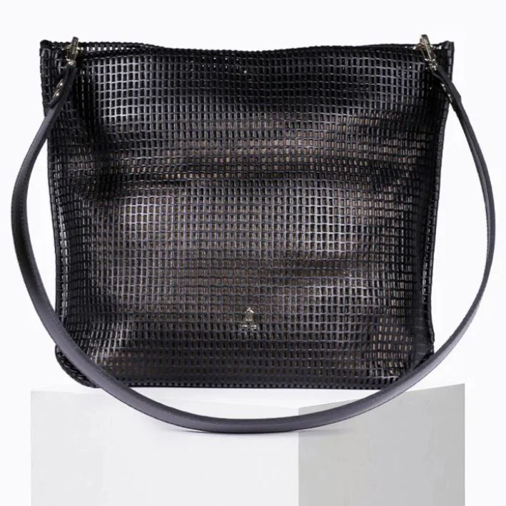 Le sac Mid Noir est un modèle unique et versatile, fabriqué en cuir de veau perforé coloris noir, construit avec un fil de cuir. Ce sac au design innovant peut se porter ouvert comme un petit cabas ou plié en format baguette. Il se module selon vos envies.