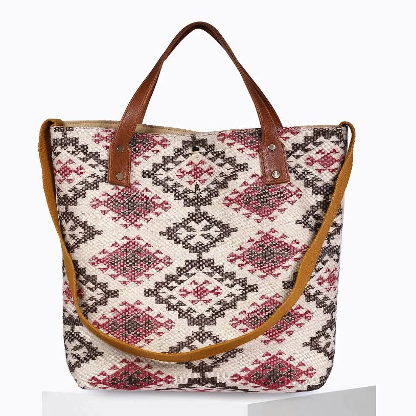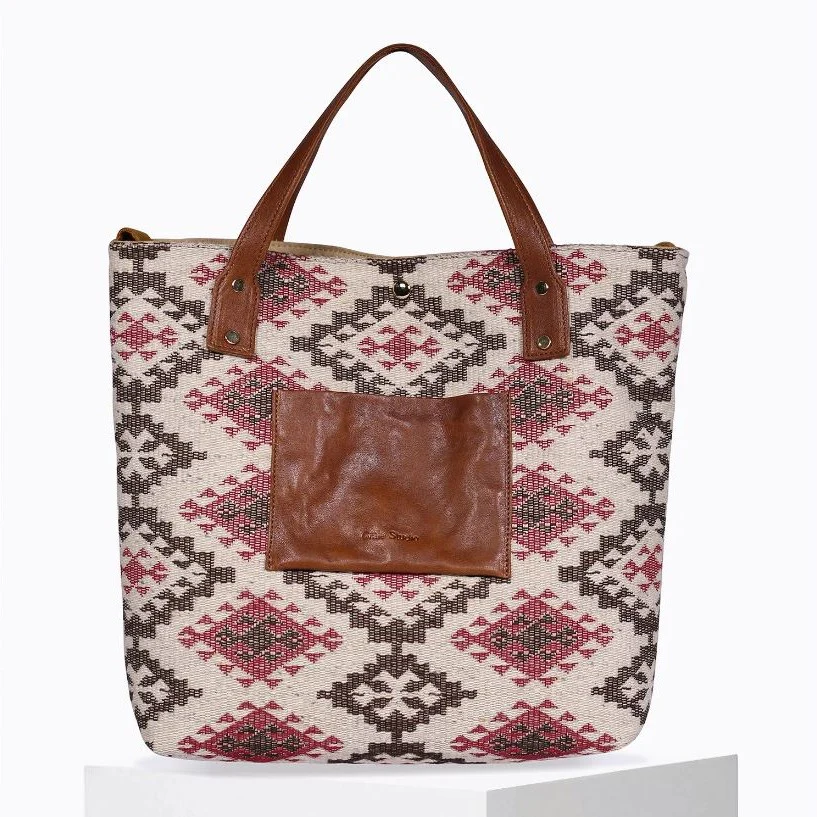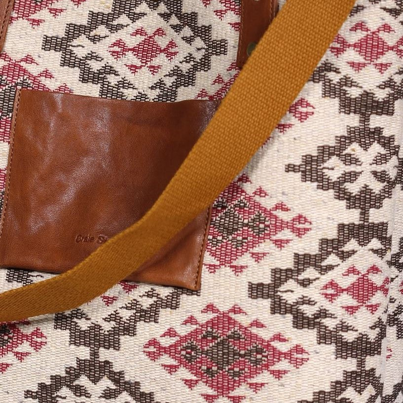 Sac cabas indispensable en version toile Kilim. C’est une épaisse toile d’origine italienne tissé de motif ethnique taupe et rouge foncé sur une trame écru.