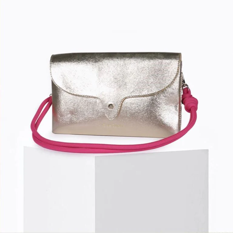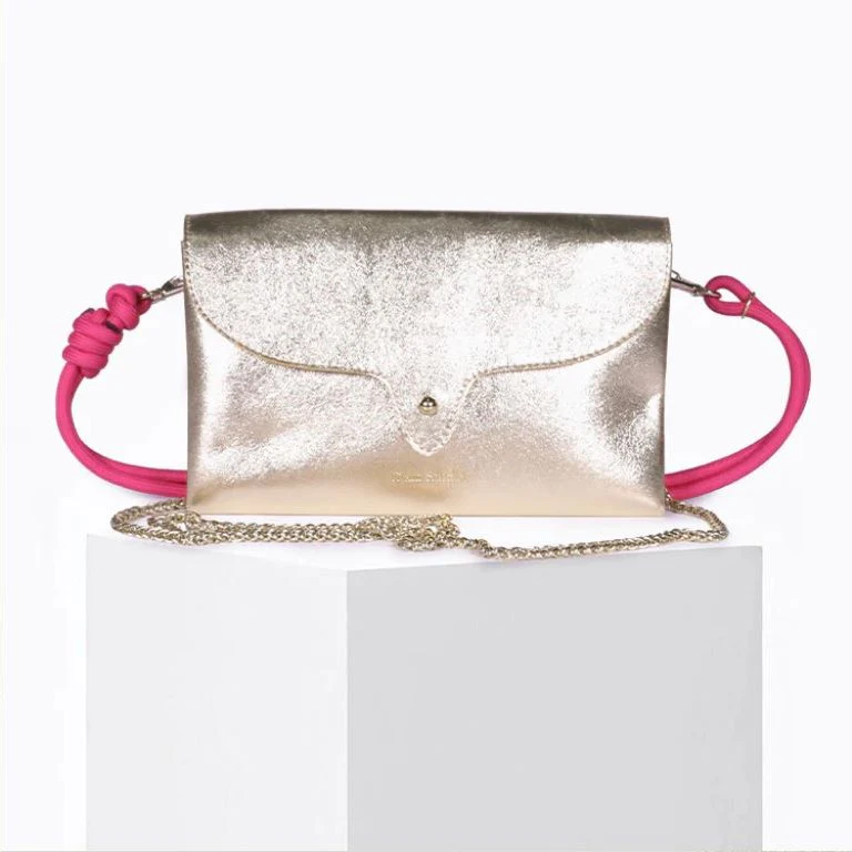 Livré avec deux bandoulières – une fine chaîne dorée pour un look habillé et une corde d’escalade colorée plus décontractée!