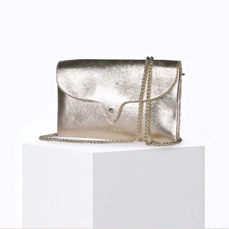Le modèle Week de CRAIE STUDIO est un sac pochette en cuir d’agneau métallisé or clair doublé de cuir tannage végétal.