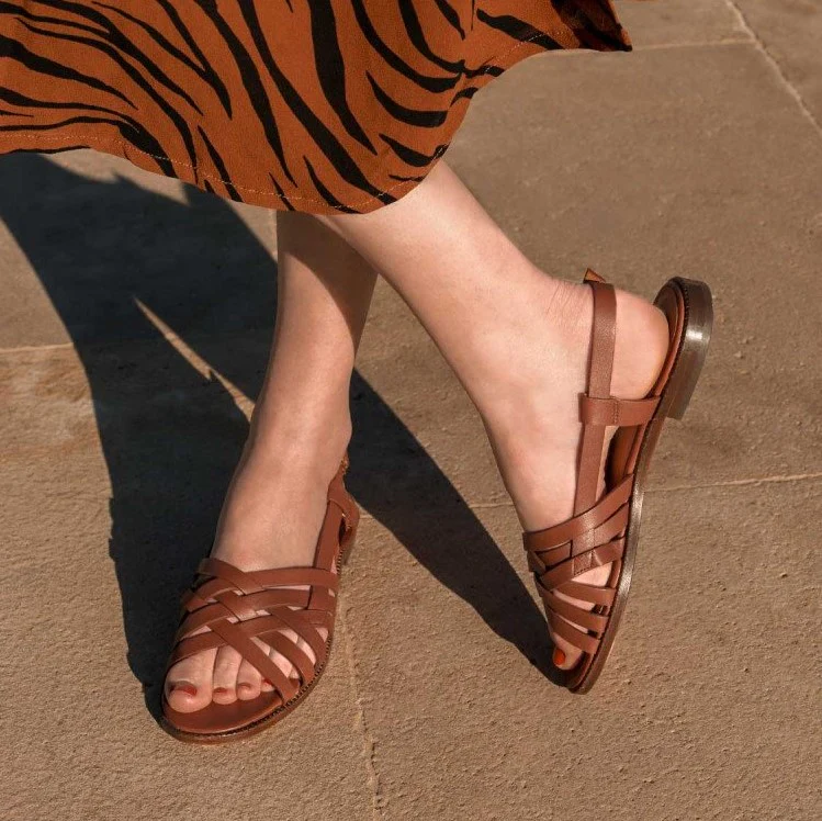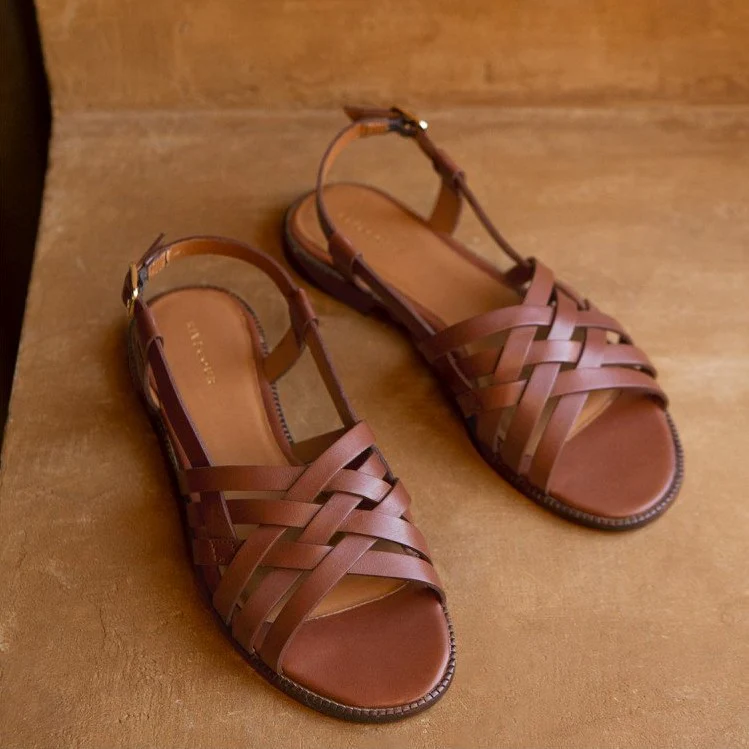 Sandales plates couleur cuir cognac, pratique et chic, cette paire ouverte est parée de jolies tresses à l’avant.