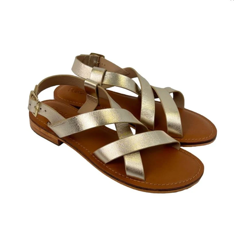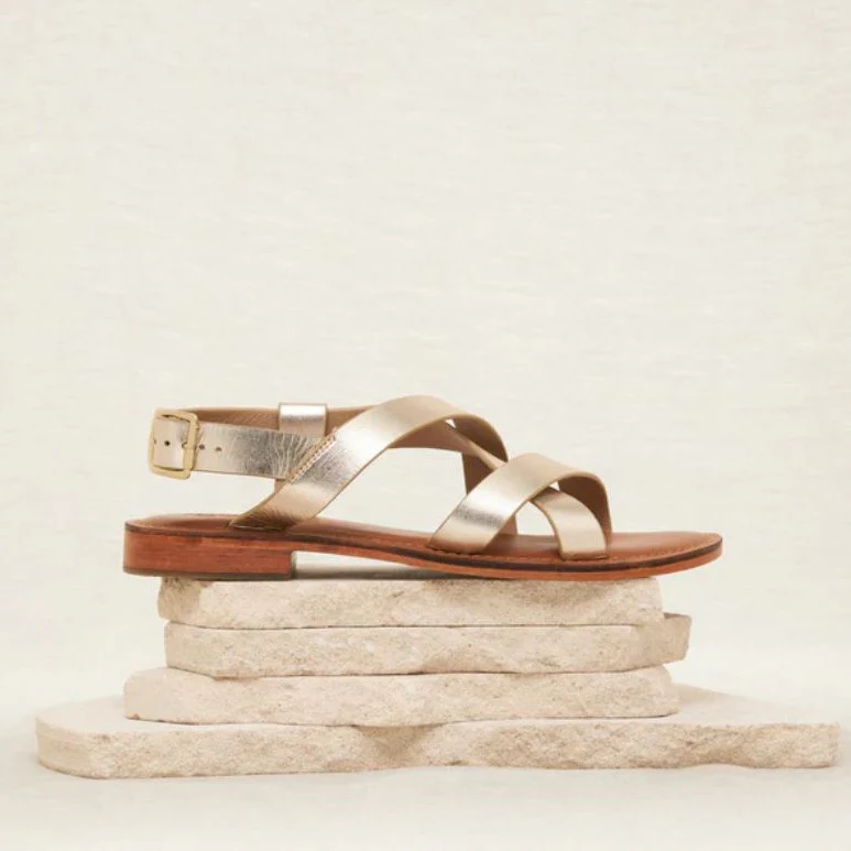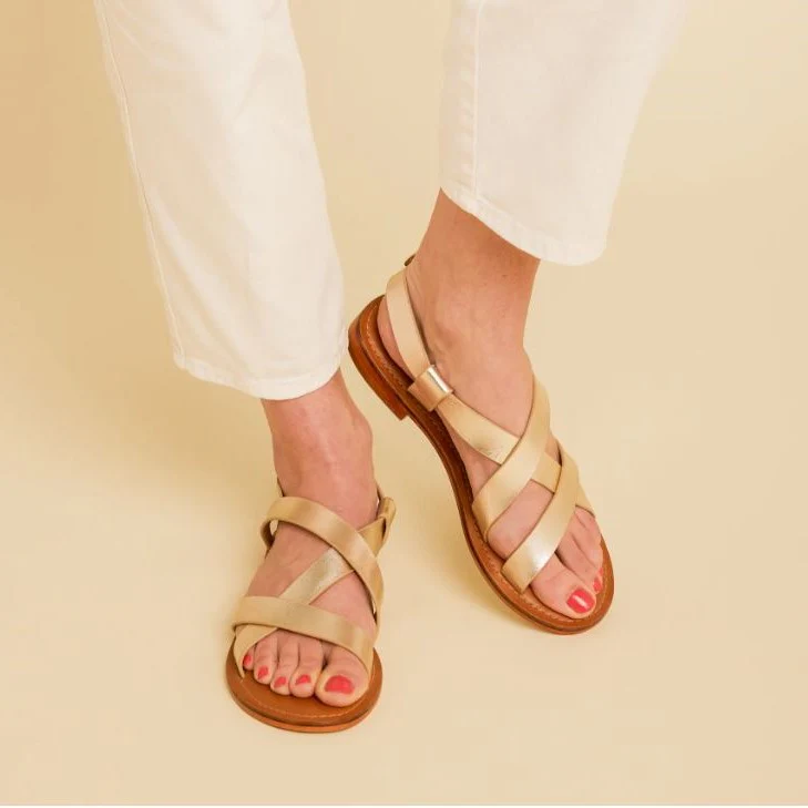 Sandales plates détail brides croisées. Système de fermeture par une bride talon à boucle ardillon dorée.