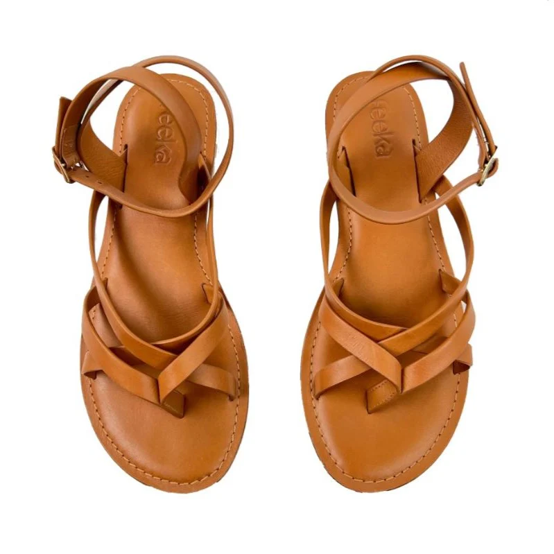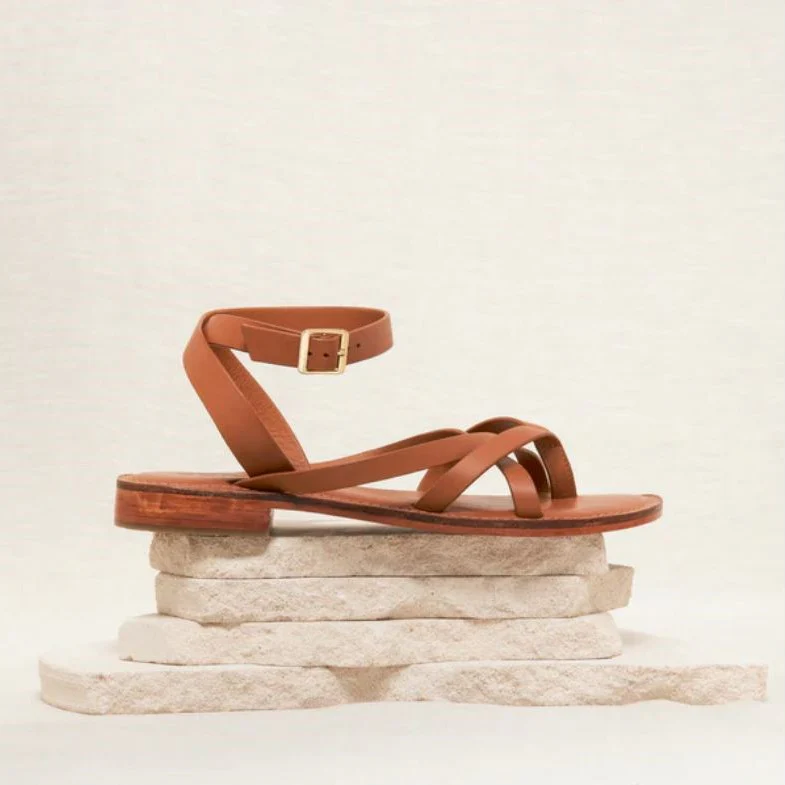 Sandales plates détail brides croisées. Système de fermeture par une bride talon à boucle ardillon dorée.