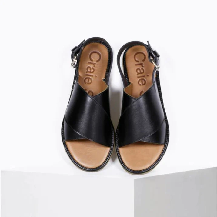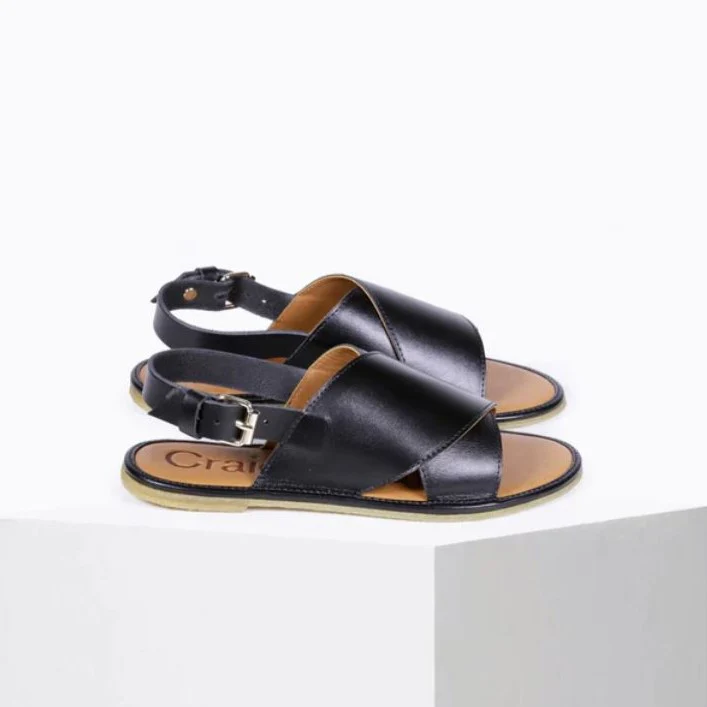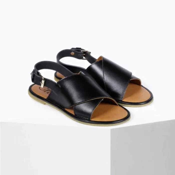 Sandales noires éco-conçues, biodégradable et confortable fabriquées dans un cuir de vachette noire semi-végétal. Elles sont pensées avec 2 larges brides croisées sur le coup de pied, pour un bon maintien du pied et une attache arrière pour une marche confortable.