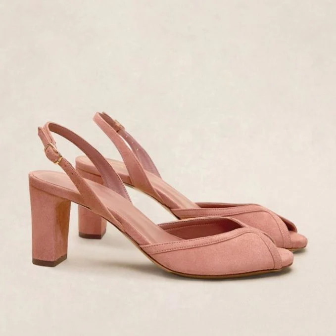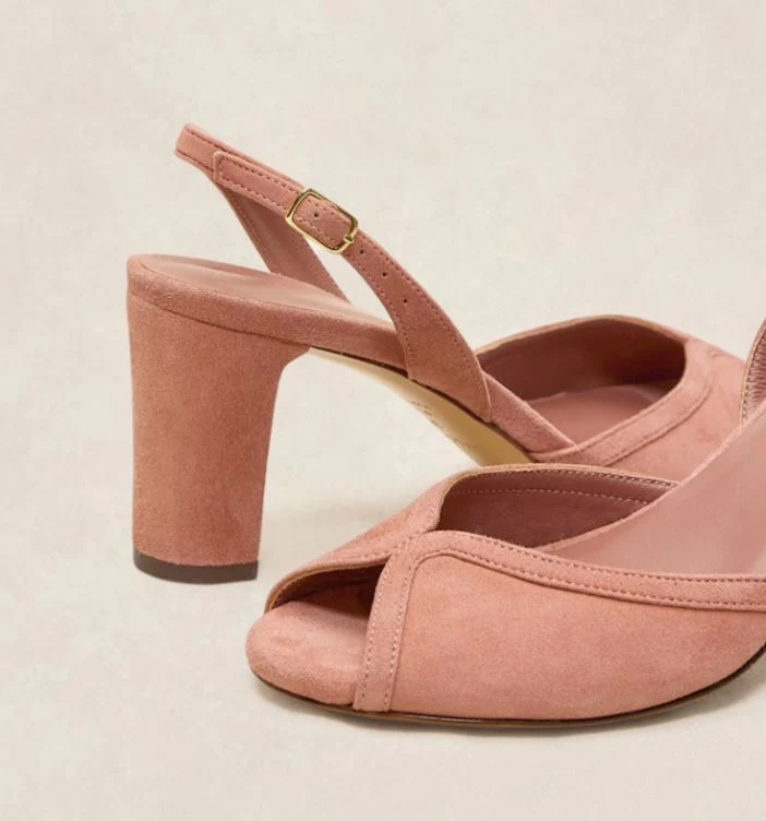 Talon bloc enrobé en chèvre velours : 70 mm. Arrière slingback.