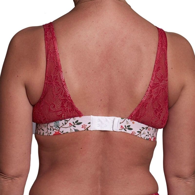 Soutien-gorge rouge camélia, forme en cache-coeur avec joli décolleté.