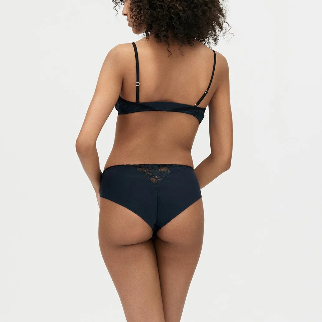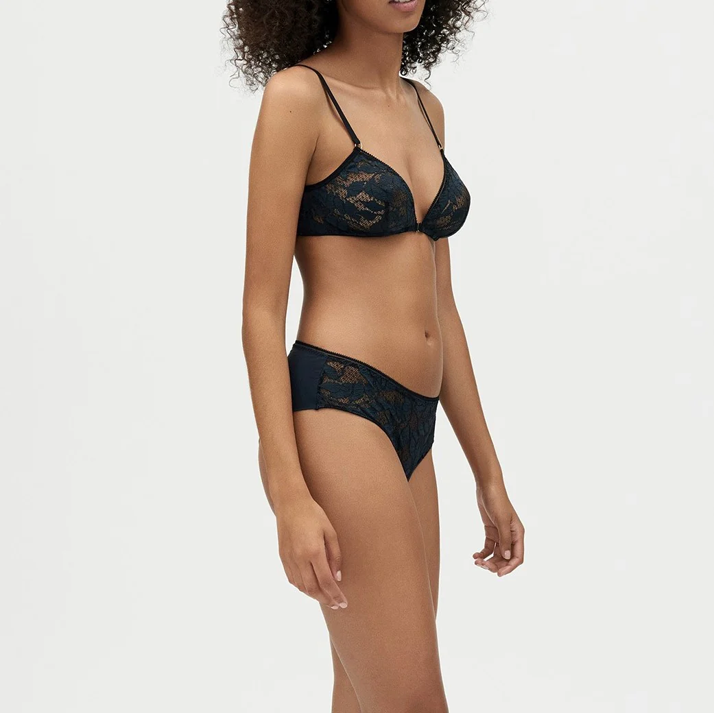 Soutien gorge forme triangle qui s’ouvre sur le devant. Confectionné dans une fine dentelle française ornée de motifs floraux. Ce soutien-gorge au coloris ardoise intense conjugue fraîcheur et délicatesse.