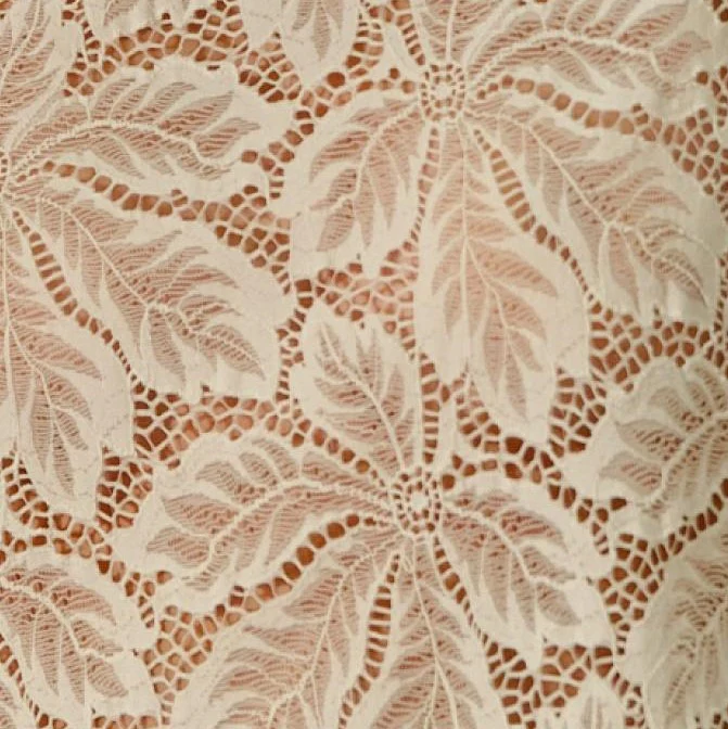 Dentelle OEKO TEX respectueuse de l’environnement motifs feuilles écrues et élastique doré.