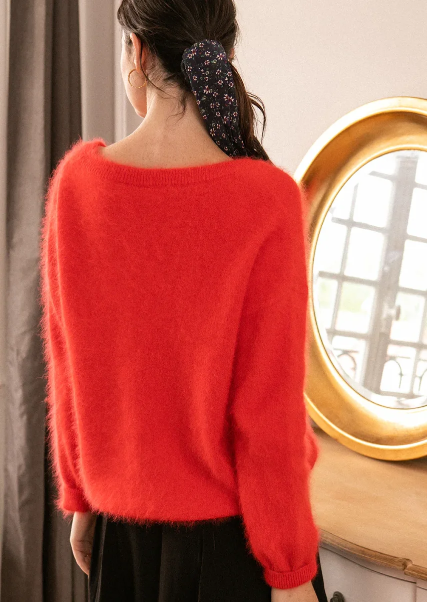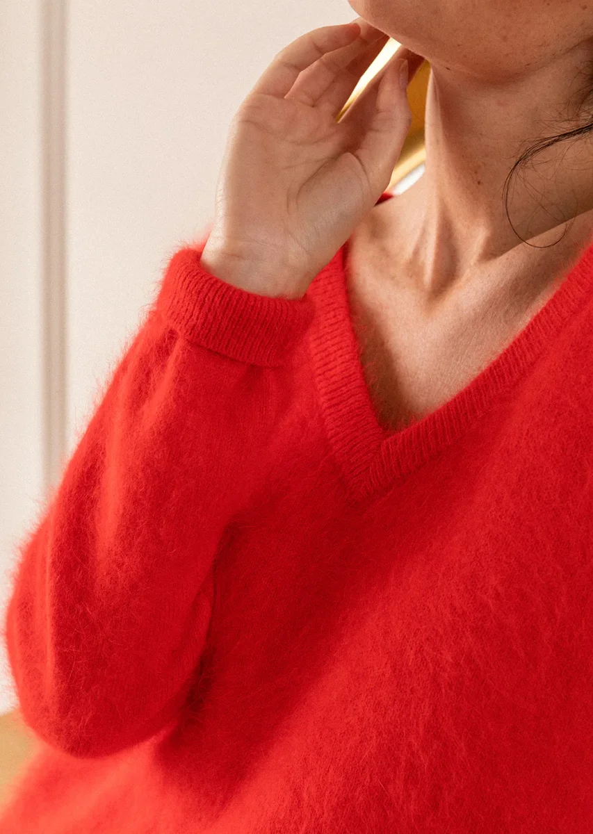 Pull ultra doux couleur rouge orangé en angora col V à manches longues.