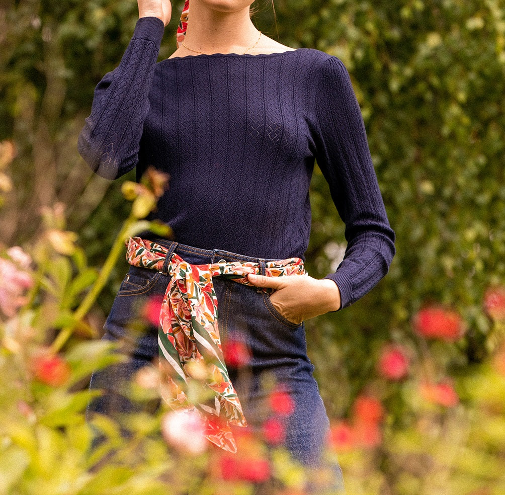 Pull bleu à fine maille col bateau décolleté dans le dos qui lui apporte féminité et élégance!