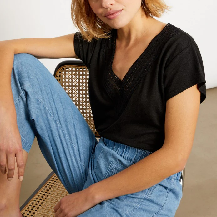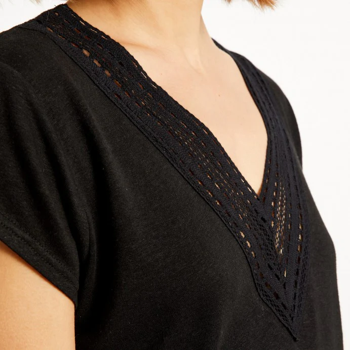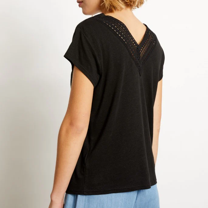 T-shirt noir manches courtes aux détails raffinés et encolure en V devant et derrière, ornée d’une incrustation en dentelle confectionné dans un mélange de lin et Modal. Ces matières sont respirantes, thermorégulatrices et régulent l’humidité. Vous serez à l’aise toute la journée !