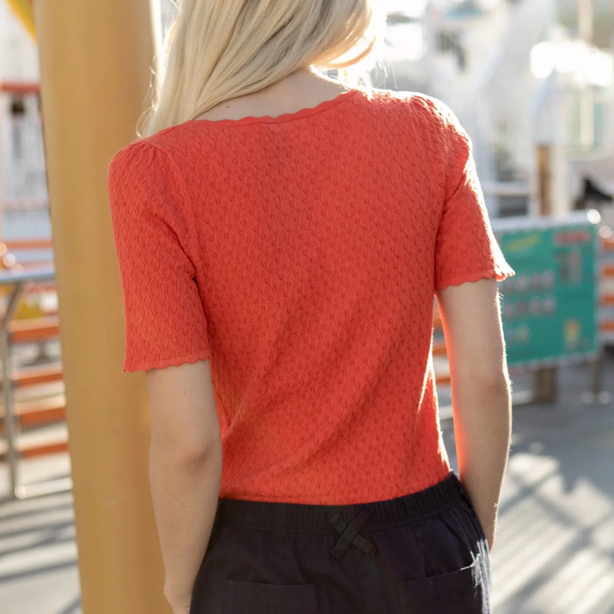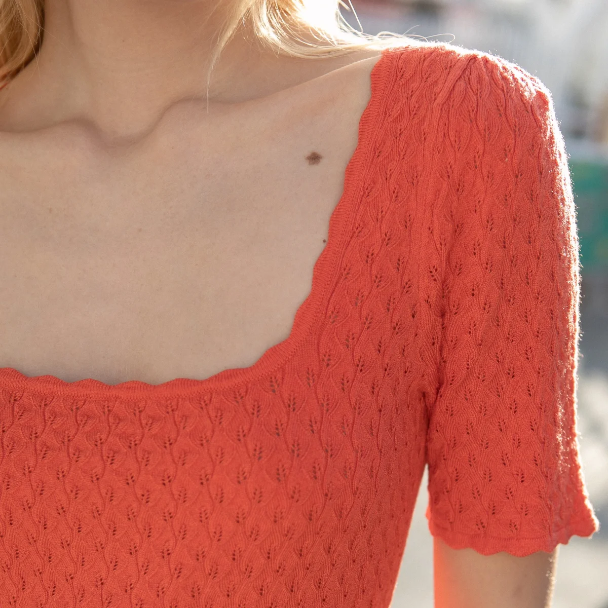 Pull manches courtes encolure carré. Sa forme à l’avant le rend original et unique. Sa maille est fine et tressée. Coupe près du corps, parfait pour la mi saison ou les soirées d’été!