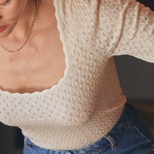 Le pull Adélie Jasmine avec son encolure carré est un vrai coup de cœur retro et un allié de mi-saison.