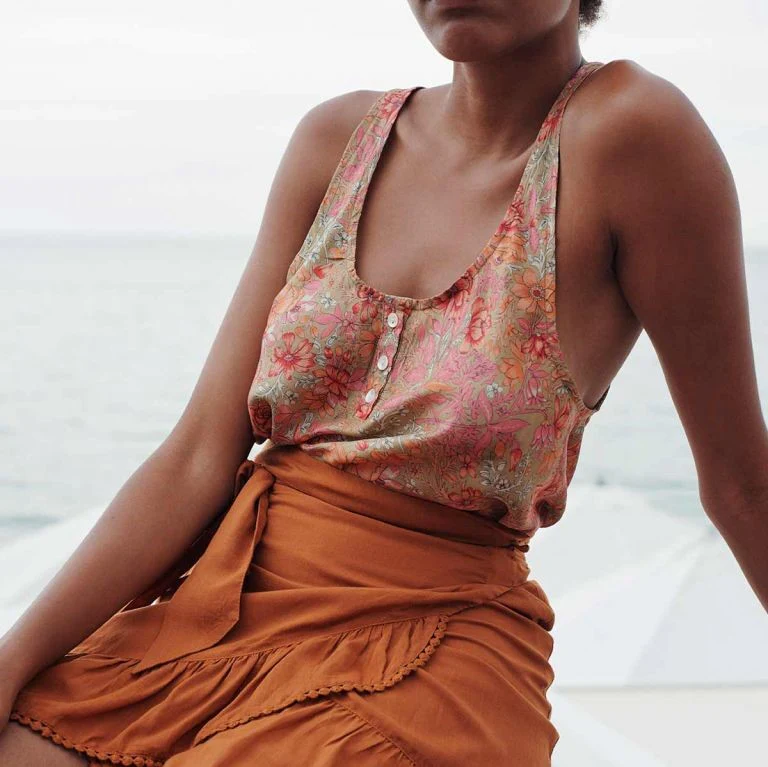 Top sans manche en soie, léger et fluide, il est très facile et agréable à porter. Il se mariera parfaitement à vos tenues d’été, en journée ou en soirée grâce à sa matière de qualité et son imprimé pastel. 100% soie