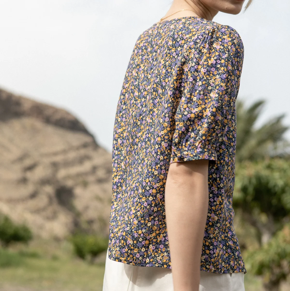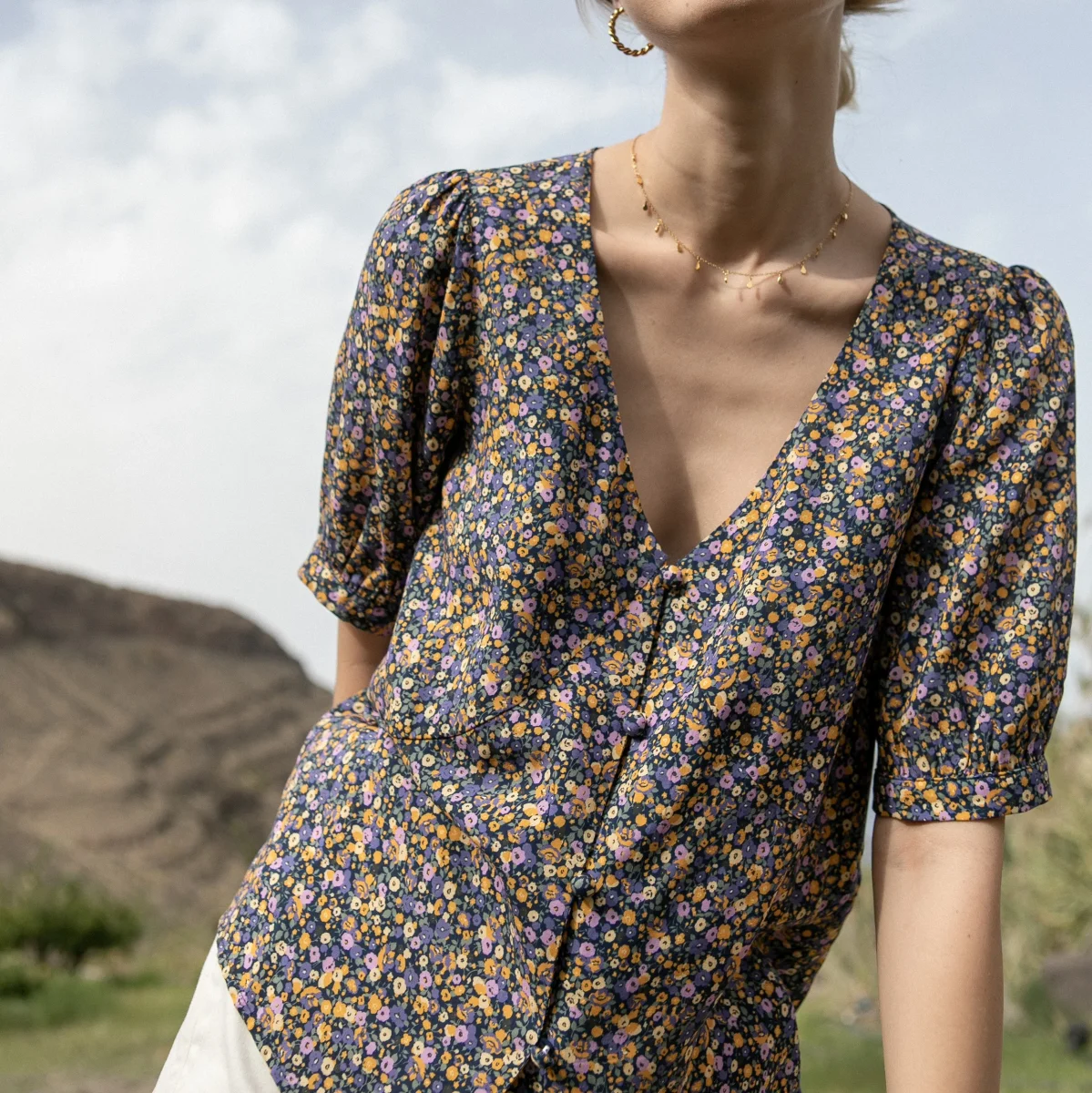 Chemise fleurie manches courtes, esprit vintage! Coupe droite avec découpe poitrine et ouverture sur l’avant en boutons. 100% viscose