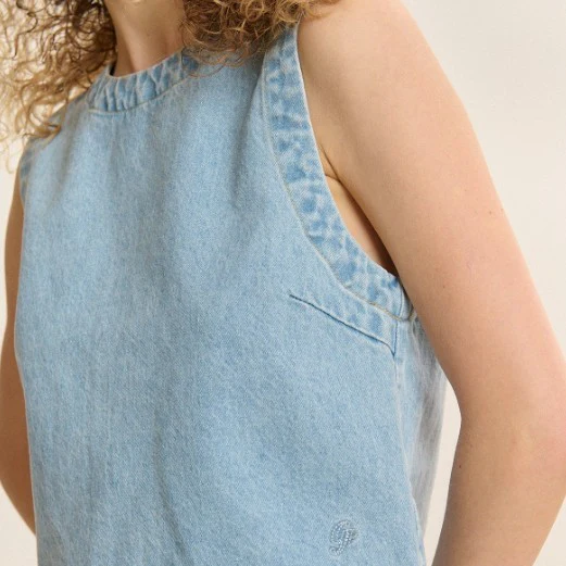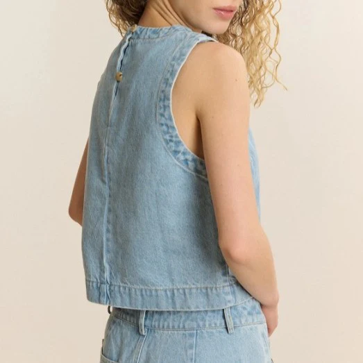 Le top CÉSAR, à la coupe ample et droite, revisite le denim dans une version courte et sans manches. Avec son esprit camisole, son col rond et sa fermeture boutonéne au dos, ce top dessine une silhouette casual-chic.