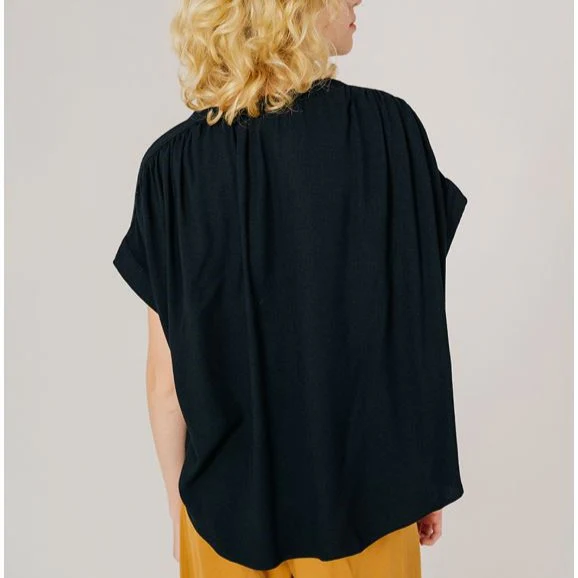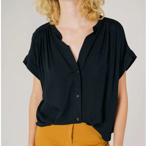 Cette blouse boutonnée sur le devant séduit par sa coupe fluide et féminine. Son col droit lui apporte une touche de sophistication, tandis que ses découpes froncées aux épaules et son dos froncé ajoutent du volume et du mouvement.