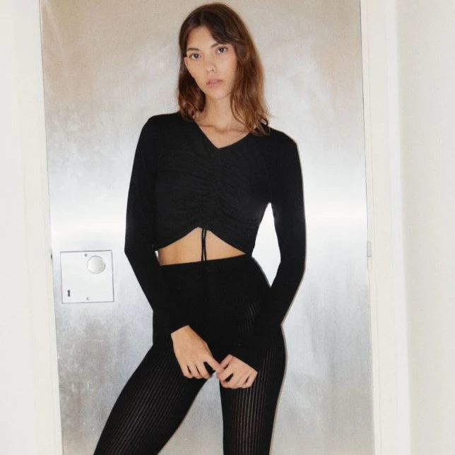 Top noir mini manches longues, avec longueur ajustable sur le devant.