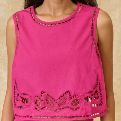Top sans manches en popeline de coton et découpes type dentelles. Coupe courte pour associer facilement aux pantalons et jupes tailles hautes.