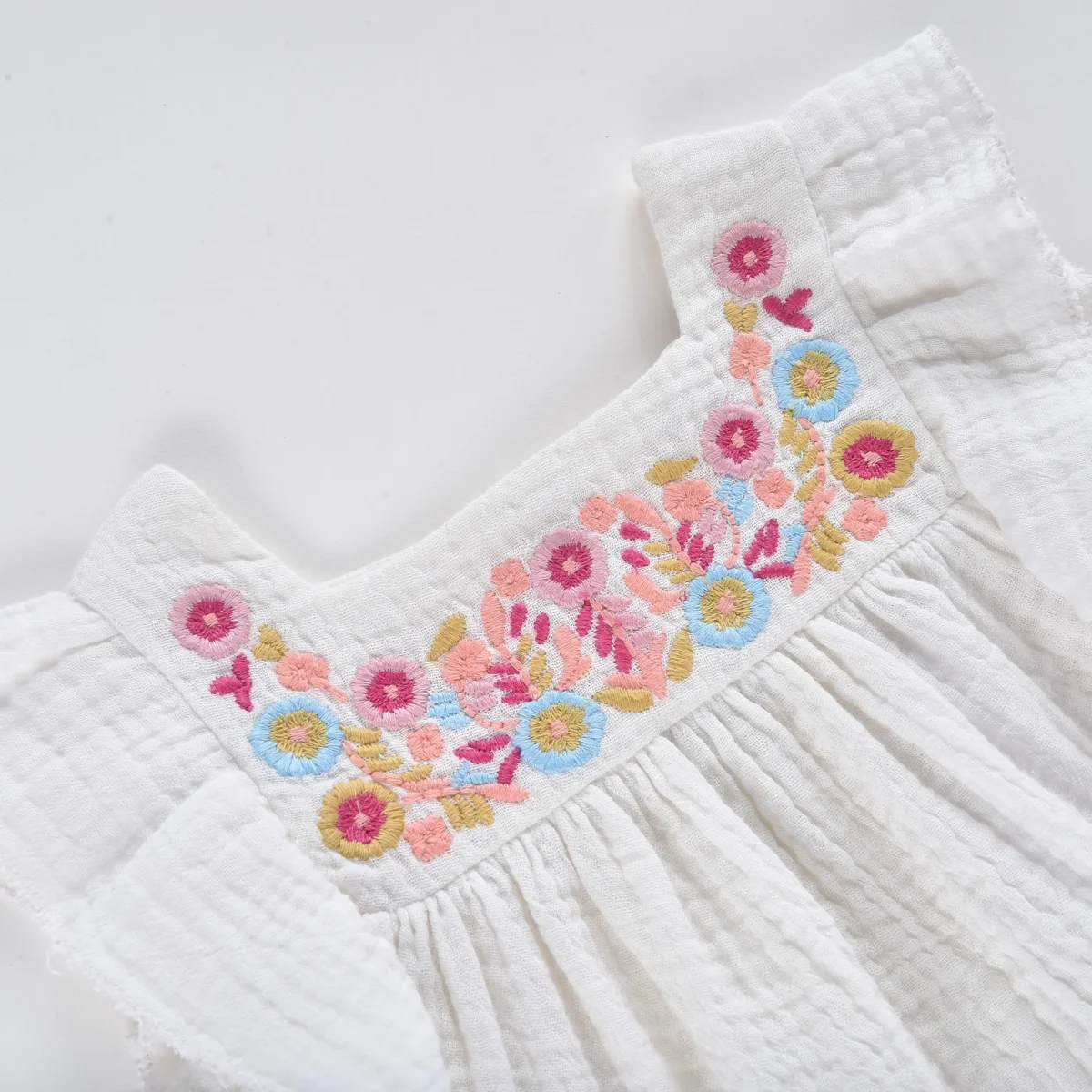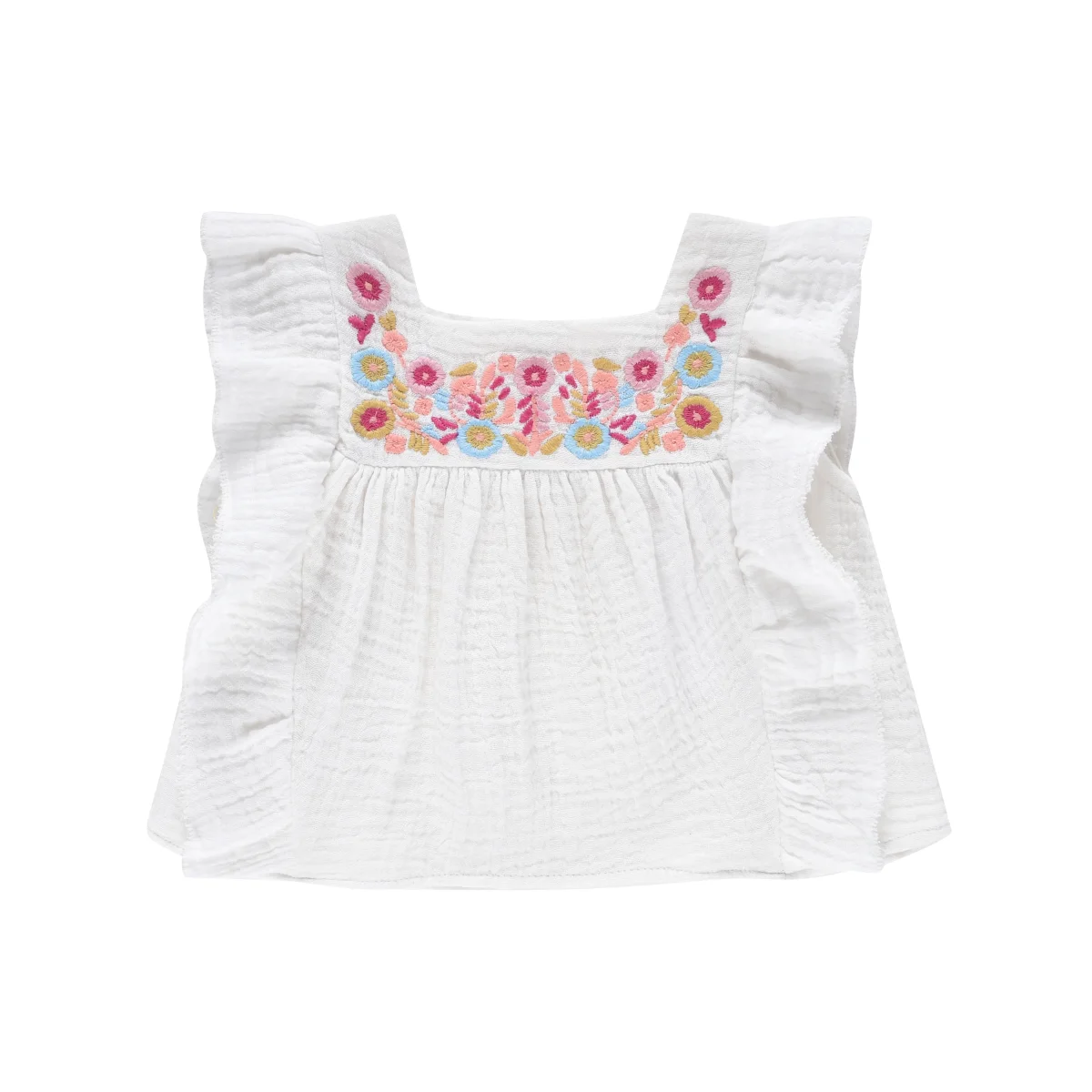 Blouse blanche encolure carré en double gaze de coton. C’est LA blouse dont les plus petits ont besoin et qui fait la différence avec ses broderies colorées promettant un été fleuri !