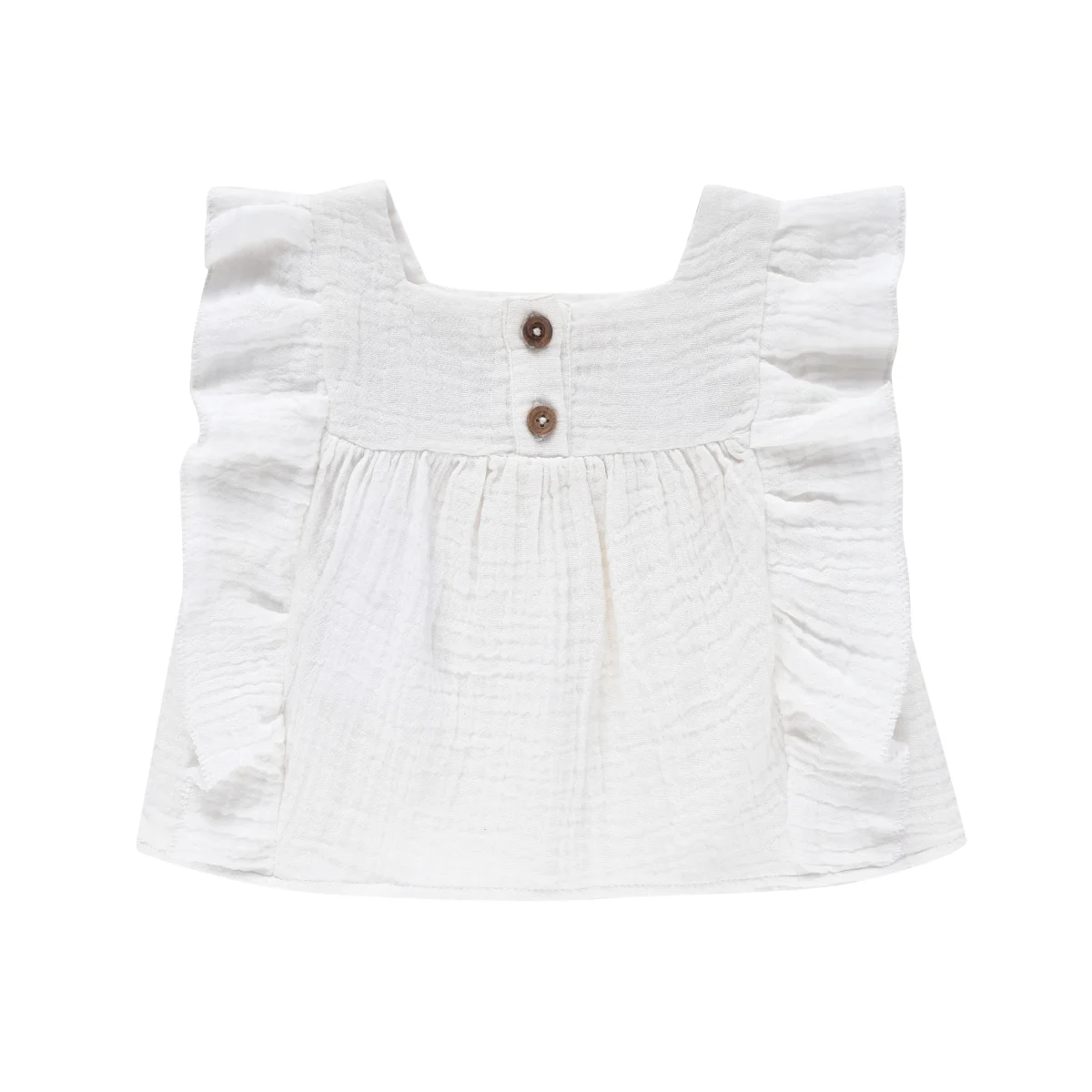 Blouse blanche encolure carré en double gaze de coton. C’est LA blouse dont les plus petits ont besoin et qui fait la différence avec ses broderies colorées promettant un été fleuri !Boutonnage dans le dos avec boutons en bois100% cotonLavage à 30° délicat