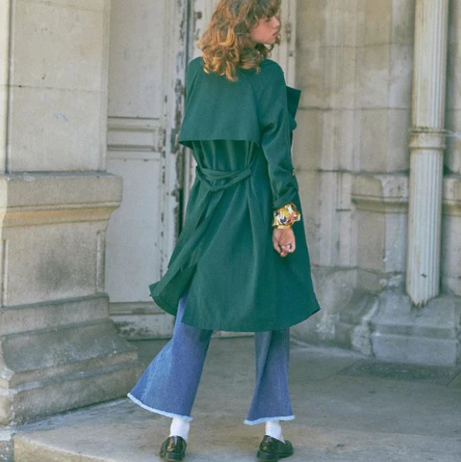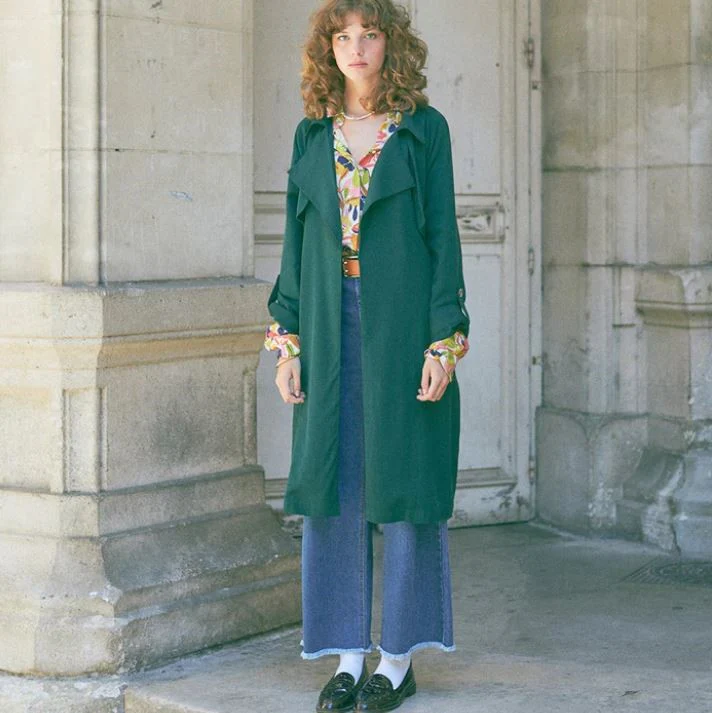 Veste de mi saison façon Trench coat, long de couleur vert sapin.