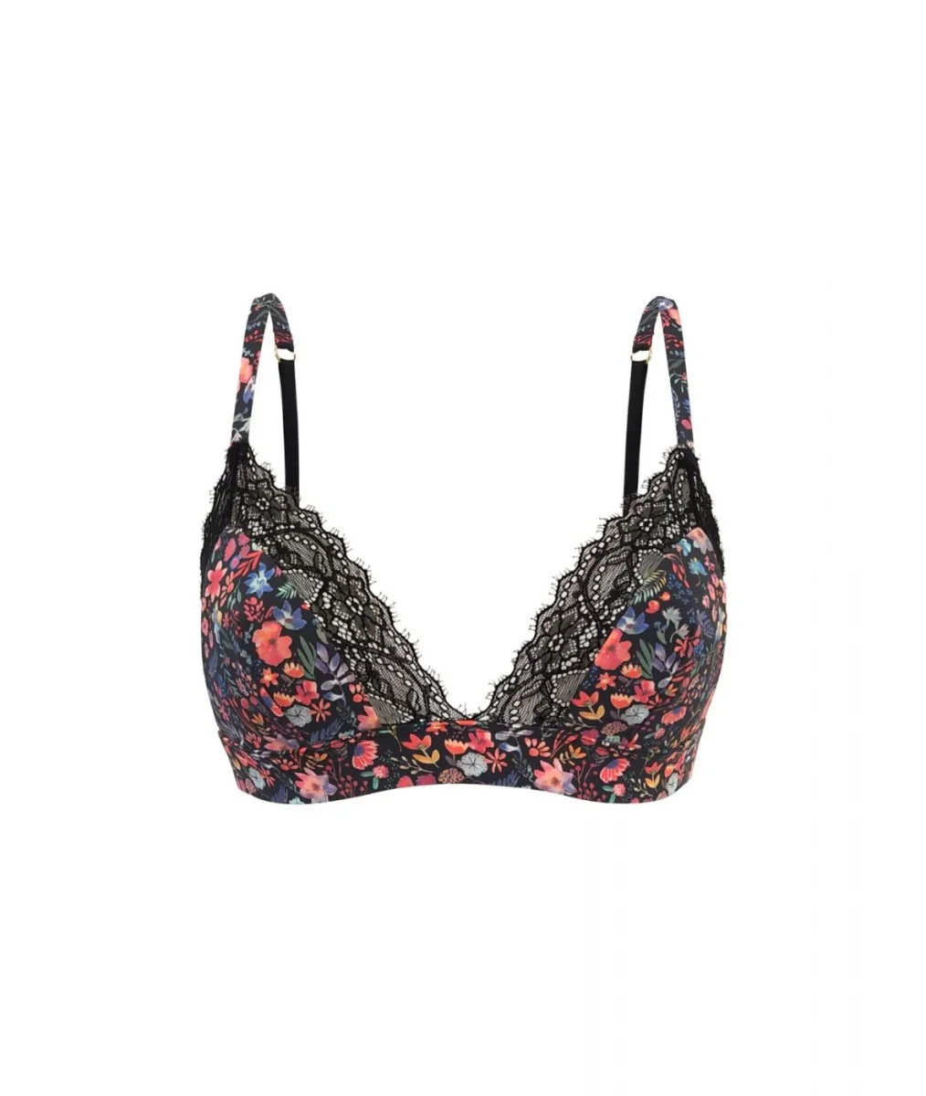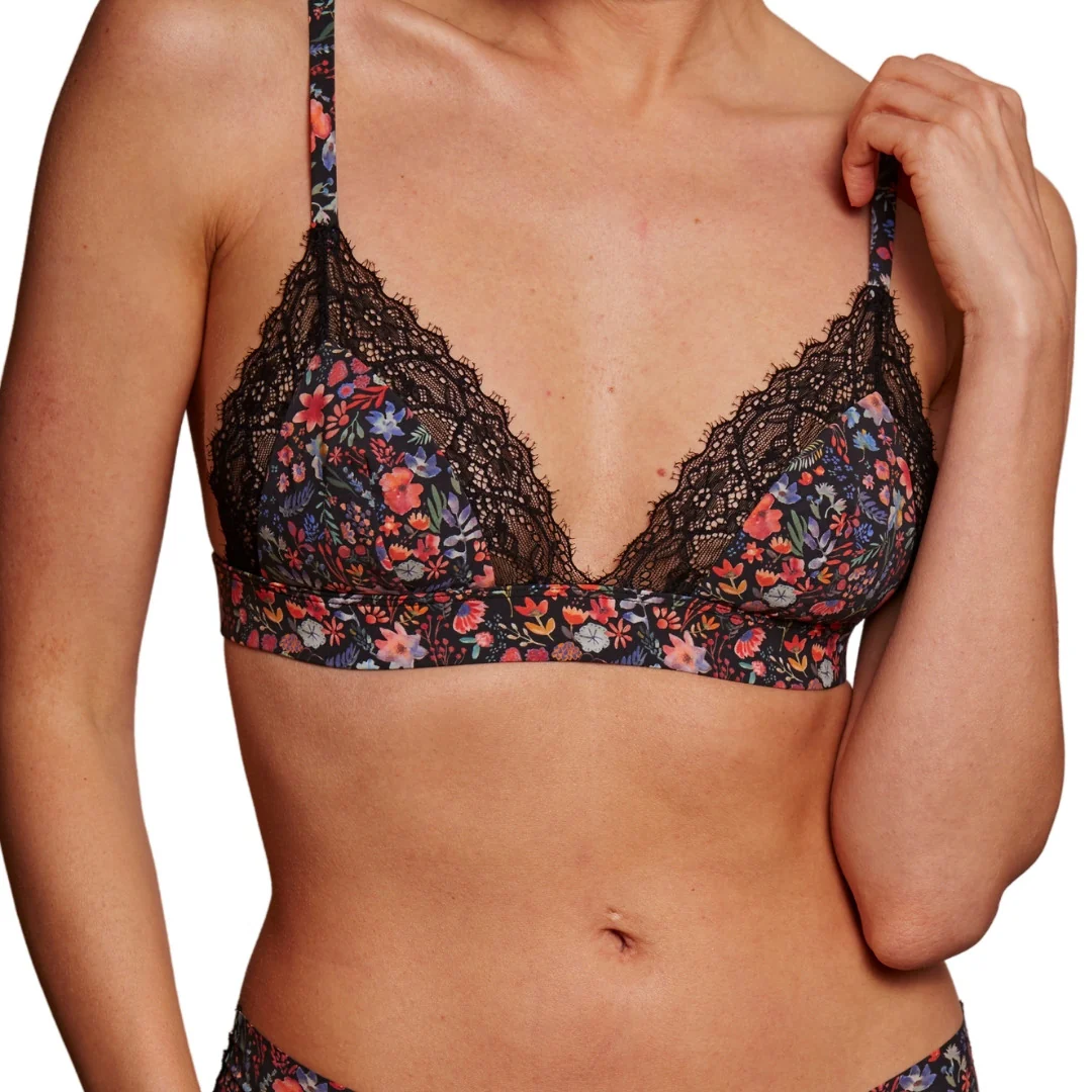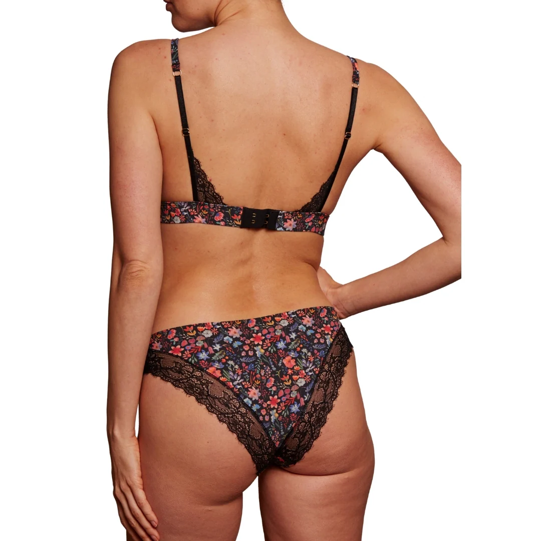 Ce soutien-gorge triangle est conçu en microfibre éthique et galbe la silhouette en n’utilisant aucune armature ni rembourrage. Sa dentelle lui apporte en plus le côté sexy. Son imprimé, exclusif à la marque, floral sur fond noir est original sans trop en faire. Tissu et dentelle produits en France, confection portugaise.