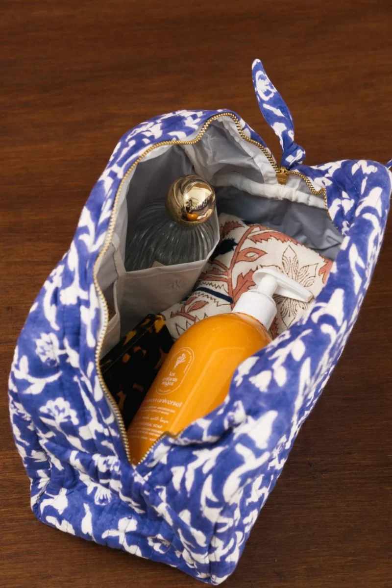 La trousse indispensable pour tous vos essentiels ! Grande, pratique et élégante, elle vous accompagne partout : salle de bain, week-end ou à glisser dans un sac 48h. Avec sa grande contenance, elle garde tout parfaitement organisé. Confectionnée artisanalement à Jaipur, en Inde, selon la technique traditionnelle du block print, chaque trousse est unique.