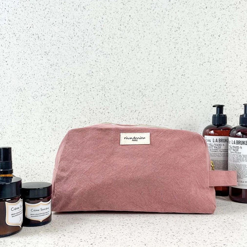 Trousse de toilette HERMEL de Rive Droite en version Bois de Rose. Son ouverture est grande et elle est très pratique et facilement transportable grâce à sa anse sur le côté. On y range tout le nécessaire de toilette! Matière Coton recyclé – 84% Coton & 16% Polyester Dimensions : L26xH18xP11 cm