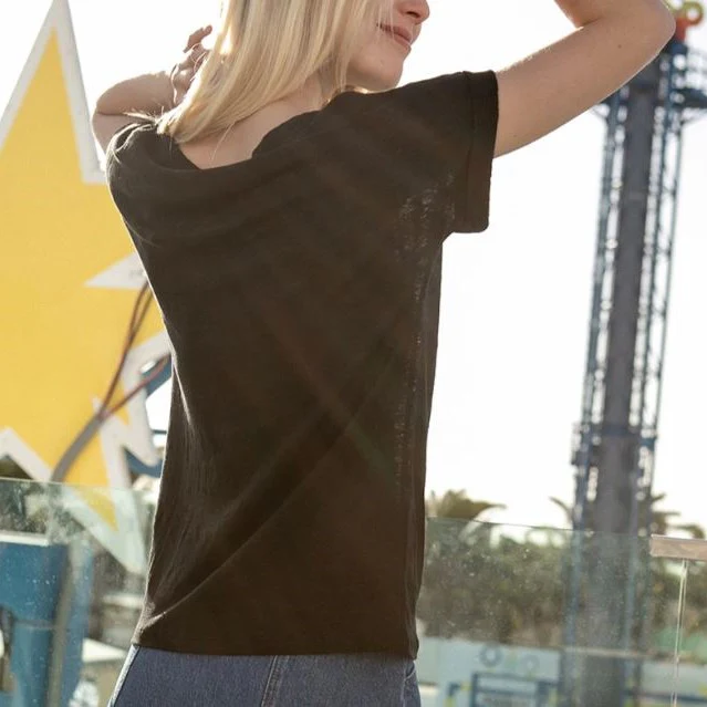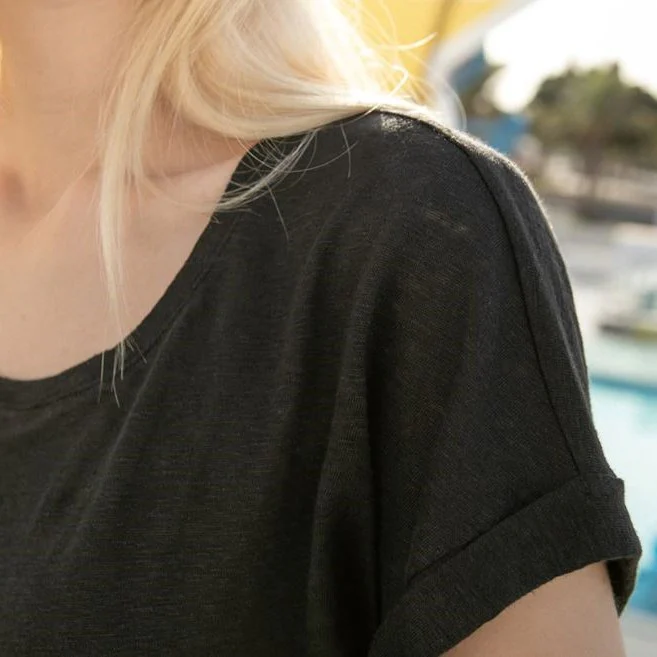 T-shirt en lin noir, col rond avec manches courtes à revers