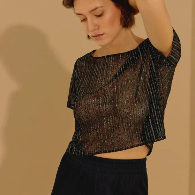 Top coupe droite et manches longues avec une maille noire plissée transparente, douce et fluide. Ouverture sur le devant refermée par un agrafage. Tombé aux hanches.100% PolyesterCréé en France et confectionné en Tunisie avec une maille portugaise.