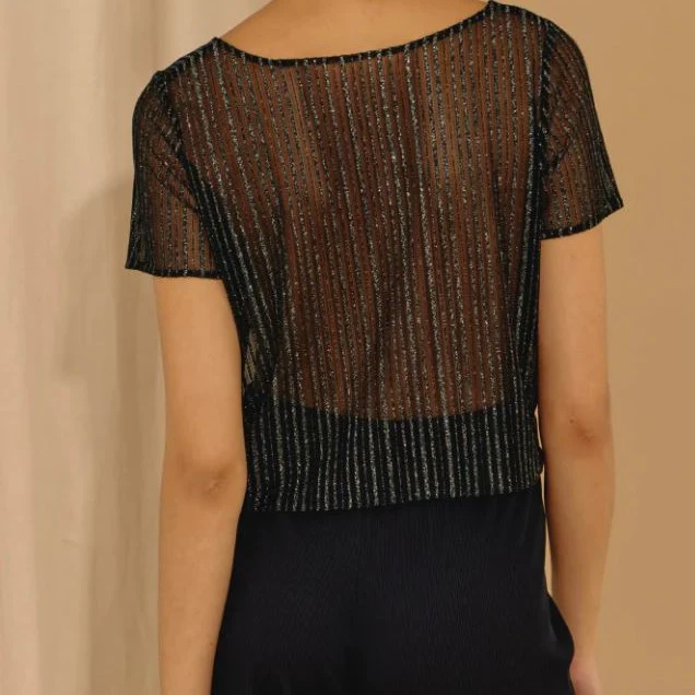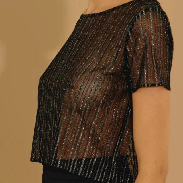 Top coupe droite et manches longues avec une maille noire plissée transparente, douce et fluide. Ouverture sur le devant refermée par un agrafage.