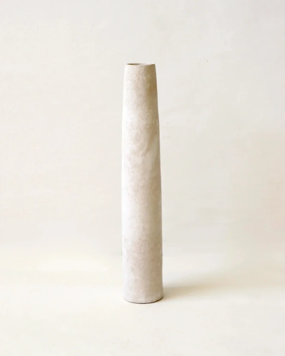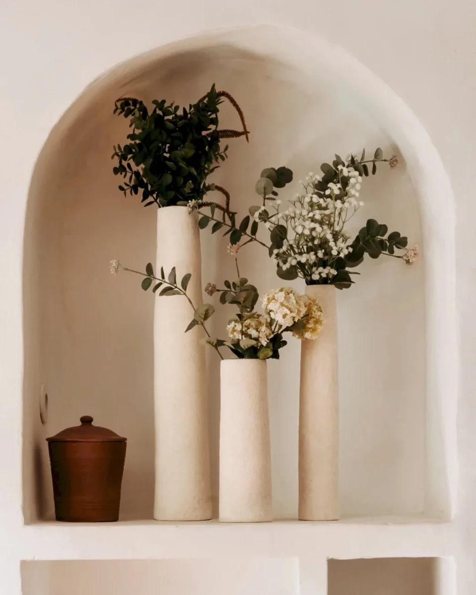 Décliné en trois dimensions complémentaires, ce vase se prête aussi bien à une utilisation en solo qu’en composition, pour créer un rythme élégant sur une console, une table ou une étagère. Son coloris clair et naturel s’intègre parfaitement dans des intérieurs contemporains, méditerranéens ou wabi-sabi.