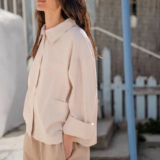 Cette veste courte, à la coupe droite et épurée, offre une allure intemporelle et structurée. Dotée d’un col chemise classique, elle se ferme à l’avant par une rangée de boutons discrets qui soulignent son style sobre et élégant. Les manches longues apportent une touche de rigueur, parfaite pour les journées fraîches ou les superpositions légères.