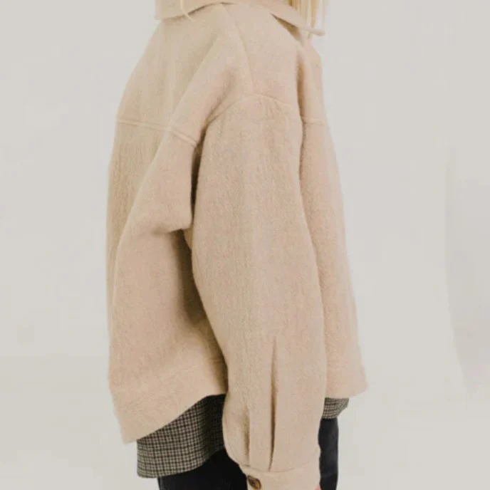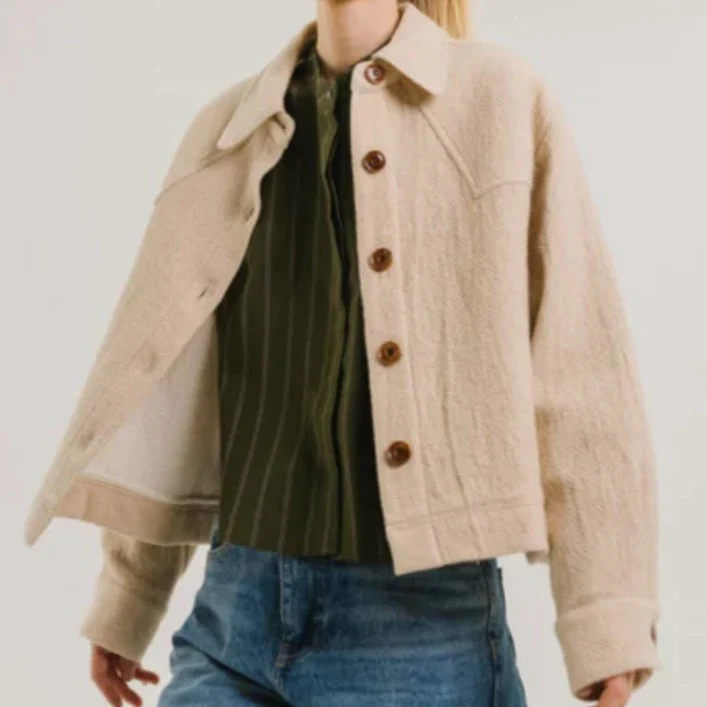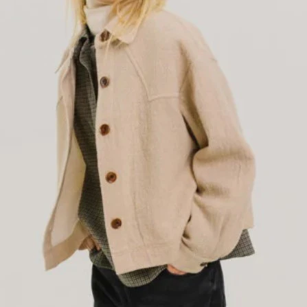 Veste courte et ample en coton et laine, non doublée, dotée d’un col classique. Ses emmanchures basses et ses poignets larges boutonnés lui confèrent confort et style. Un empiècement structuré et des plis au dos apportent volume et allure, pour une pièce à la fois sobre et affirmée.
